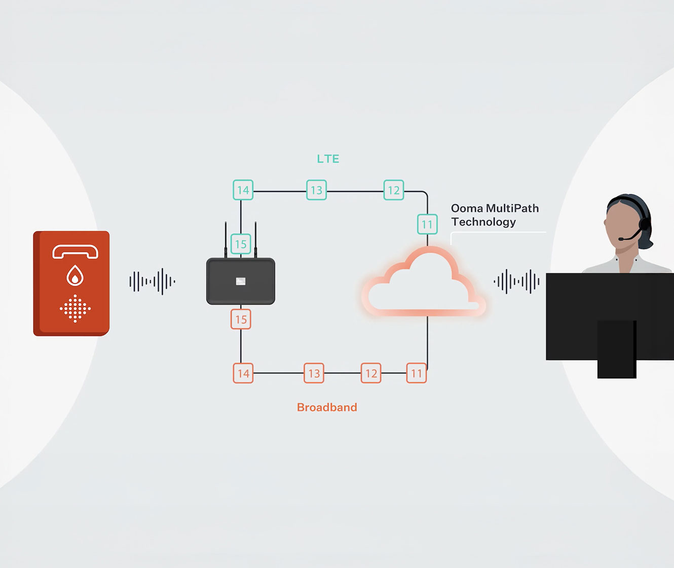 MultiPath is a patented connectivity feature in Ooma AirDial that continuously sends voice traffic over both the device’s LTE connection and the customer’s wired internet simultaneously. It constantly monitors both links and dynamically uses the best performing connection. If one link degrades or fails, the other immediately carries the traffic without dropping the call — ensuring uninterrupted service for life-safety and business critical devices.